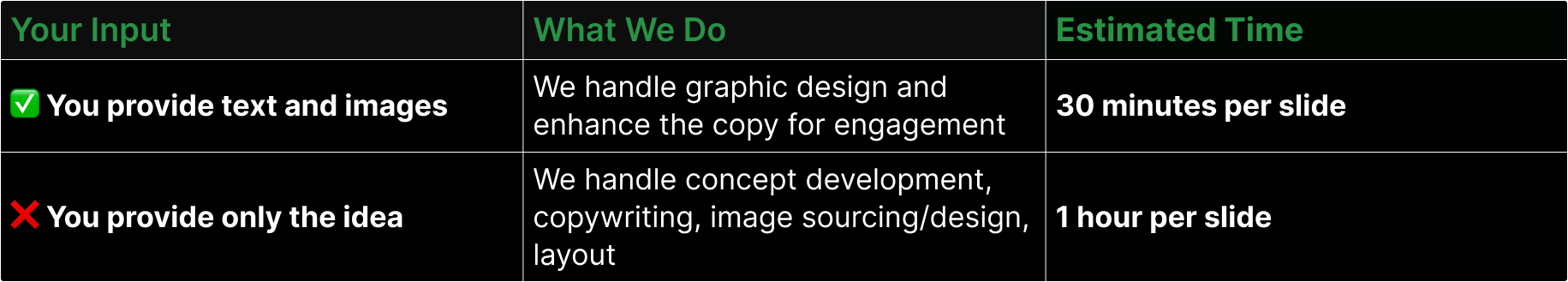 This applies to carousels for Instagram, presentations, emails, and other similar content formats.