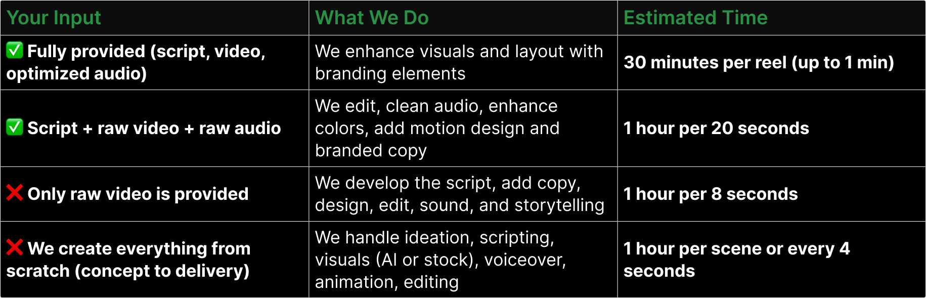 At Tasking Studio, we believe in transparency, efficiency, and delivering top-tier content that reflects your brand. To help you understand how we estimate project timelines and ensure fair pricing, we’ve developed a clear methodology based on the level of input you provide and the type of content requested.